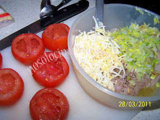 Lavamos los tomates y con una cuchara los vaciamos. Sofreímos la cebolla y la mezclamos con la pechuga de pollo picada (yo la piqué a cuchillo porque me gusta más que picada a maquina) y el queso rallado. Salpimentamos y procedemos a rellenar los tomates. Si os gusta podéis echar al sofrito lo que habéis sacado de los tomates...si no lo guardamos para otra ocasión....NADA SE TIRA TODO SE APROVECHA.